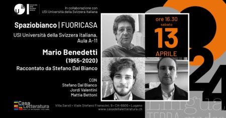 LUGANO - Il poeta Mario Benedetti, scomparso nel 2020, sarà al centro di un evento commemorativo sabato 13 aprile alle ore 16.30, organizzato dalla Casa della Letteratura per la Svizzera italiana nell'ambito della rassegna di poesia contemporanea Spaziobianco. L'incontro avrà luogo presso l'USI - Campus Ovest - Aula A-11 e vedrà Stefano Dal Bianco, poeta e grande amico di Benedetti, dialogare sulla sua opera insieme a Jordi Valentini e Mattia Bettoni.