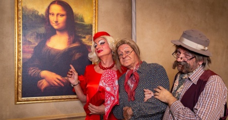 Così, già nella prima scena, Mabilia (Enrico Dalceri), chic più che mai - come si conviene a un viaggio a Parigi – ammira la Gioconda insieme a mamma Teresa (Antonio Provasio) e papà Giovanni Colombo (Lorenzo Cordara, al suo debutto in questa stagione), che sfoggiano gilet gialli catarinfrangenti nelle sale del Louvre, mentre fuori i manifestanti fanno dei loro gilet gialli il simbolo della protesta, inseguiti dai gendarmi (Giordano Fenocchio e Fabrizio Rossi).