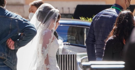 I paparazzi si sono infatti scatenati ieri per immortalare l'uscita dalla chiesa di Santa Maria in Campitelli dei novelli sposi della pellicola di Ridley Scott "House of Gucci", le cui riprese proseguono a Roma.