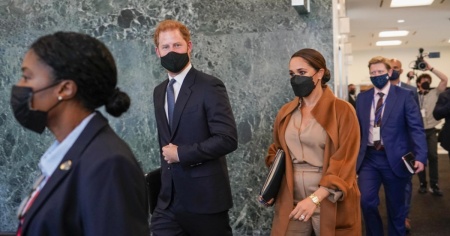 Nelle foto diffuse online si vedono il Duca e la Duchessa del Sussex camminare all'interno del quartier generale delle Nazioni Unite sull'East River: lei indossa pantaloni, camicia e cappotto color cammello, mentre lui ha un completo scuro.