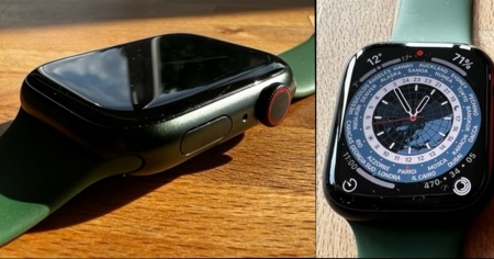 Resistenza - Apple ha spiegato di essere riuscita a rendere la Serie 7 più resistente rispetto al passato. Per la prima volta l’Apple Watch aggiunge la resistenza IP6X alla polvere (e alla sabbia) e anche lo schermo dovrebbe essere più resistente. Apple ci è riuscita mantenendo sostanzialmente gli stessi materiali ma modificando la geometria del vetro. In questo modo la curvatura alle estremità devia la luce del pannello generando l’effetto arrotondato che si può vedere nei bordi dello schermo (e che risalta in modo particolare con il quadrante “contorno”).