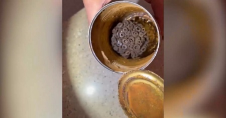 La prima cosa che verrebbe in mente sarebbe quella di buttarlo... Ma non a lei! Dopo aver tirato fuori lo smartphone e fatto partire una diretta su TikTok, ha afferrato un apriscatole e iniziato a tagliare il coperchio. Quello che ci ha trovato dentro è stato a dir poco disgustoso; un agglomerato secco e nero, rovesciato in blocco sul tavolo della cucina. Per fortuna che gli odori non passano attraverso le immagini... Per ora!
