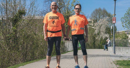 ZURIGO - Sopra l’abbigliamento sportivo la guida di Blind Jogging Bruno e il suo compagno di corsa Jörg portano gilet arancioni che contrassegnano Jörg come «non vedente» e Bruno come «guida». Corrono disinvolti uno di fianco all’altro con lo stesso passo, in modo da muovere le braccia in maniera sincronizzata nella stessa direzione. Ad unirli, un piccolo nastro nero tenuto da entrambi. Bruno guida il suo protetto con il nastro e con istruzioni verbali.