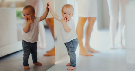 Sul nasino del piccolo di casa si potrà disegnare un pallino colorato che davanti allo specchio lui si toccherà subito, dimostrando cognizione del proprio corpo. Comincerà così lo spettacolo delle prove in cui i maschietti si divertiranno a guardarsi allo specchio indossando le scarpe o il cappello del papà e le femminucce si impiastricceranno la faccia con il rossetto della mamma. Una curiosità: i tempi di riconoscimento allo specchio sono diversi e più lunghi per i gemelli, soprattutto se omozigoti. Per loro il riconoscimento di se stessi avviene con un lieve ritardo, al pari dello sviluppo del linguaggio penalizzato da quella comunicazione non verbale che sviluppano tra loro.