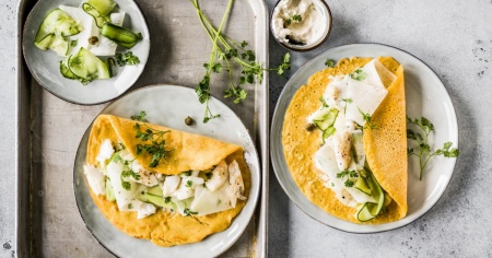 - Crespelle: in una padella antiaderente scaldare l’olio. Versare nella padella ¼ dell’impasto per ottenere una crespella di ca. 15 cm di Ø. Abbassare il fuoco. Quando la crespella è cotta e si stacca dalla padella, girarla e cuocerla sull’altro lato, quindi metterla da parte coperta. Procedere allo stesso modo con l’impasto restante. Mescolare il formaggio fresco con il cerfoglio, spalmare sulle crespelle, farcire con l’insalata e il pesce, ripiegare le crespelle e impiattare.