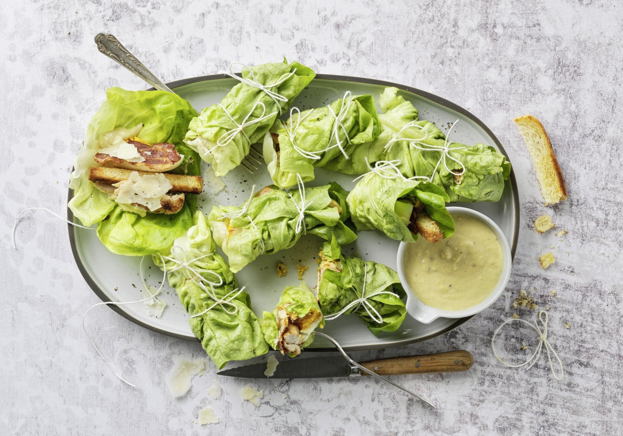 Arrotolare bene le foglie e legarle con lo spago da cucina. Servire con la salsa dip restante.