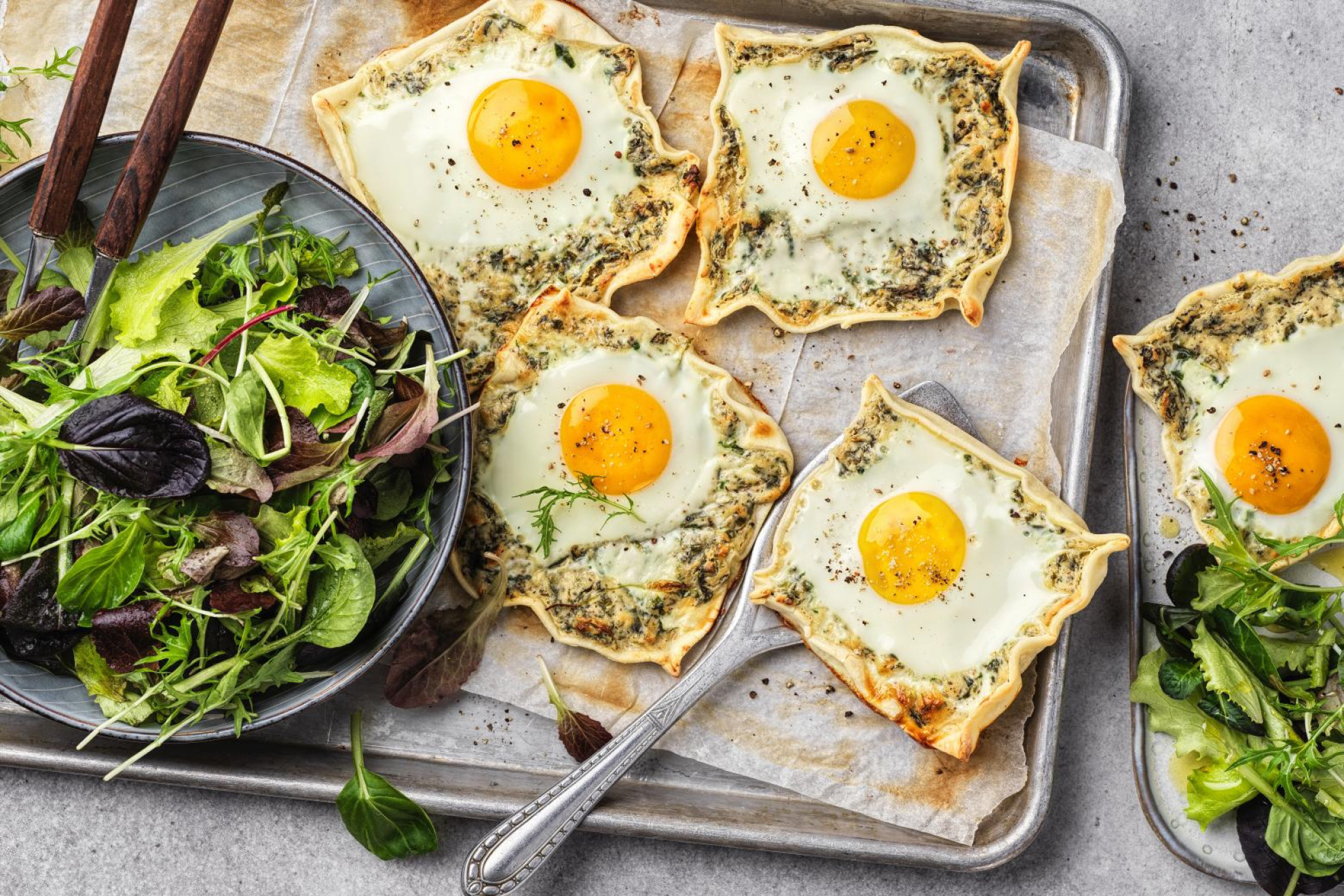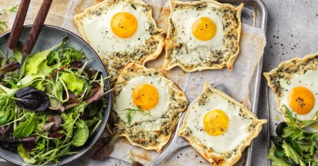 - In forno: cuocere per ca. 15 min. nella parte inferiore del forno preriscaldato a 240 °C. Togliere dal forno, rompere un uovo per volta facendolo scivolare delicatamente al centro di ciascun rettangolo di pasta. Infornare per altri 10 min. circa. Insaporire infine con il fleur de sel.