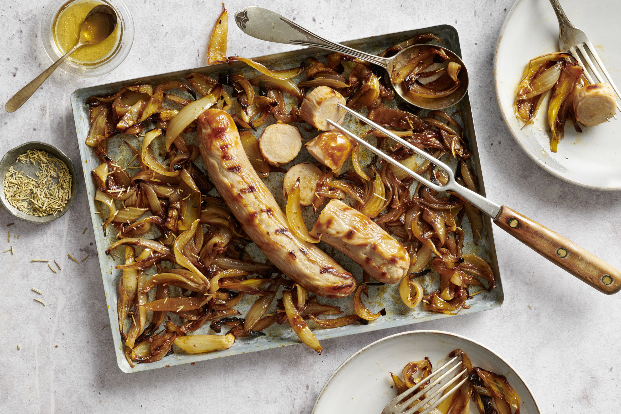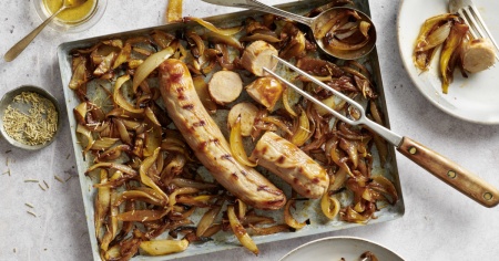 - Preparazione alla cottura: disporre le cipolle nel vassoio per la cottura al grill, mescolare con 4 c. di salsa, spennellare le salsicce con un po’ di salsa. Mescolare la salsa rimanente con il rosmarino e mettere da parte.
