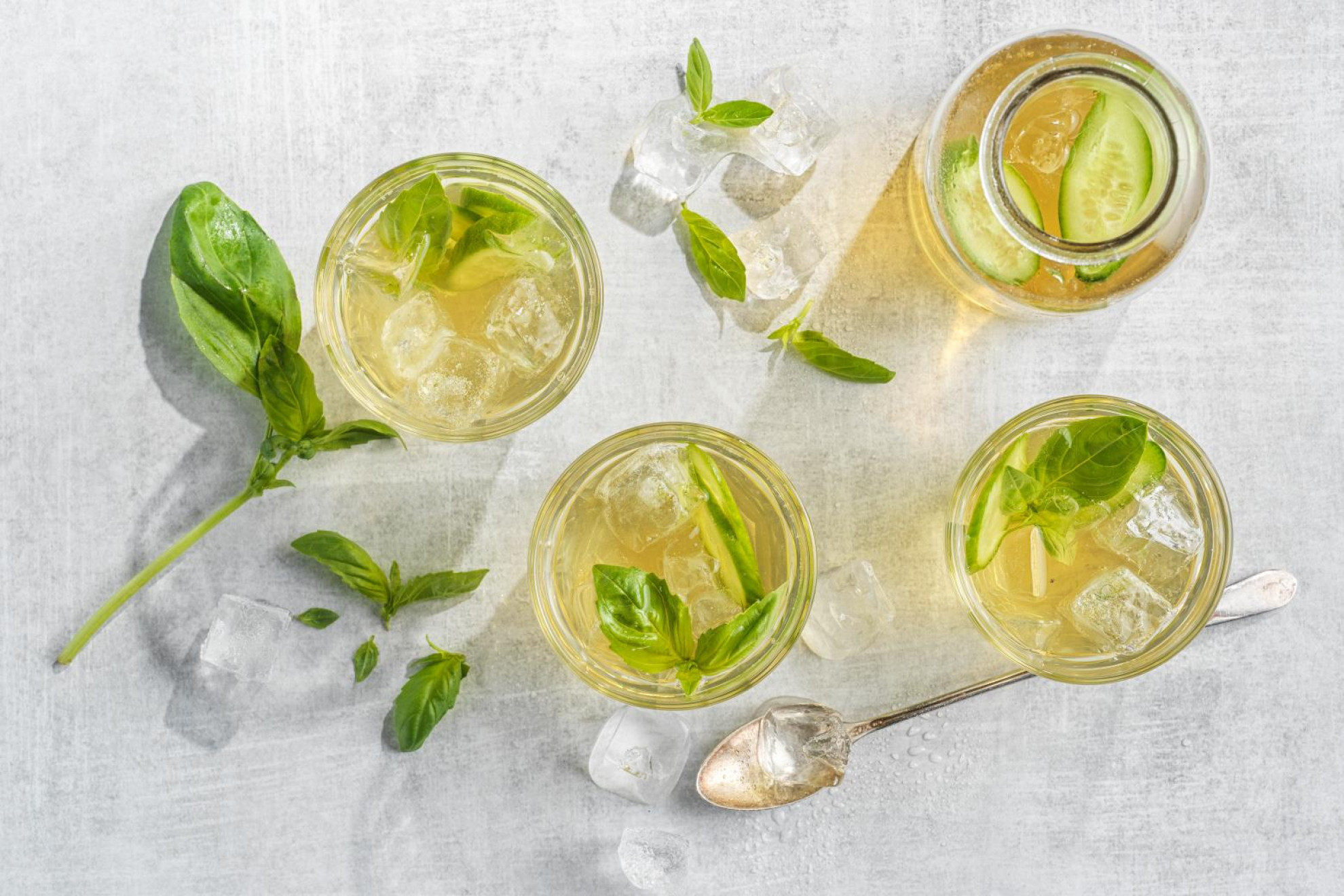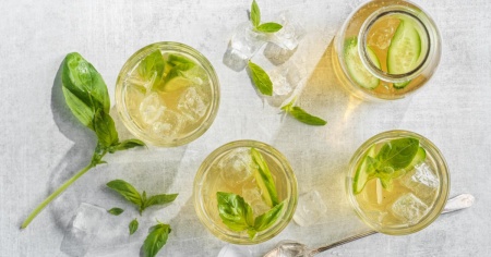 Tè freddo: mettere le bustine di tè, i cetrioli e il basilico nell’acqua e mescolare. Coprire e lasciare in infusione in frigo per ca. 12 ore o per tutta la notte.