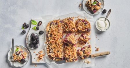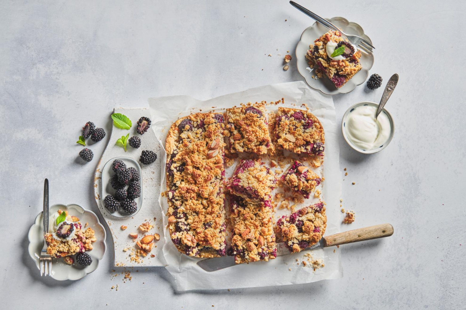 More: mescolare le more con la maizena e lo sciroppo e distribuire sulla base di crumble. Guarnire con il resto del crumble.