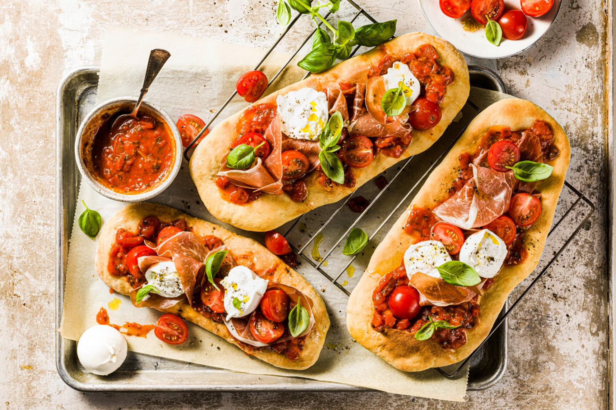 Presentazione: guarnire le pinse con la burrata, i pomodori, il prosciutto crudo e il basilico.