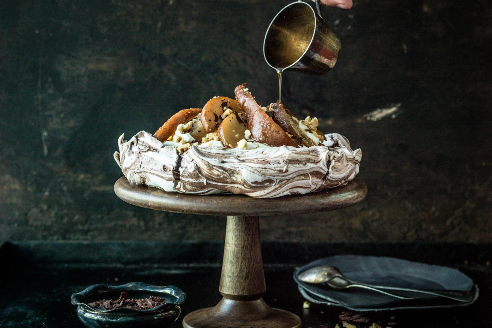 con il cacao in polvere, quindi unirlo nuovamente al restante composto con una spatola in gomma, in modo da creare un effetto marmorizzato. Stendere il composto su una placca foderata con carta da forno formando un disco da ca. 20 cm di Ø e cercando di alzarne leggermente il bordo con una spatola. - In forno/Far asciugare: cuocere per ca. 20 min. nella parte inferiore del forno preriscaldato a 150°C. Ridurre la temperatura a 120°C e lasciar asciugare la pavlova per ca. 1 ora ½. Farla raffreddare nel forno spento, tenendo lo sportello aperto.