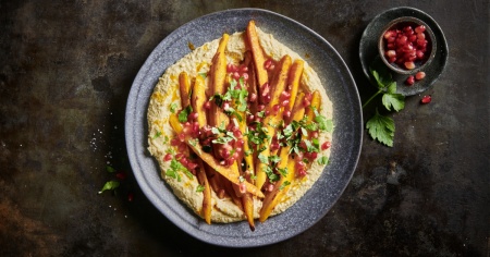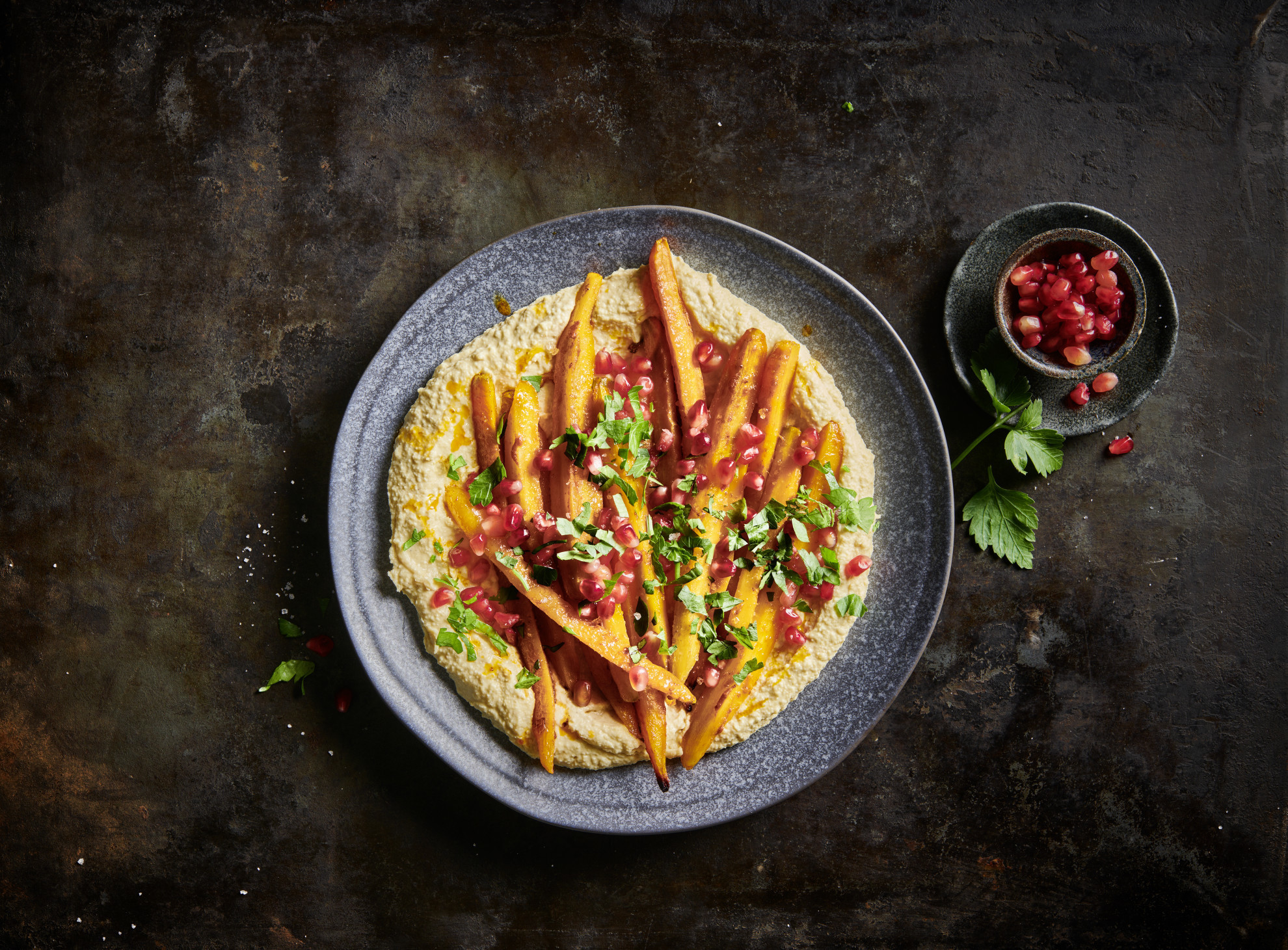 - Impiattare: condire le carote con il fleur de sel, sistemarle sull'hummus, quindi cospargere con i chicchi di melagrana e il prezzemolo.