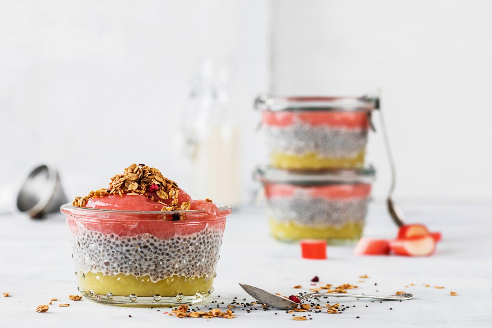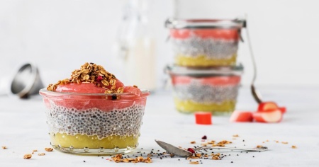- Come servire: mescolare bene il budino di chia, distribuire sulla composta di mele, mettere in frigo per almeno 2 ore. Guarnire con la composta al rabarbaro appena prima di servire.