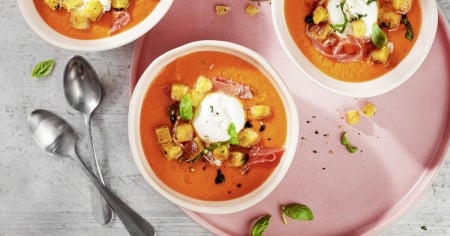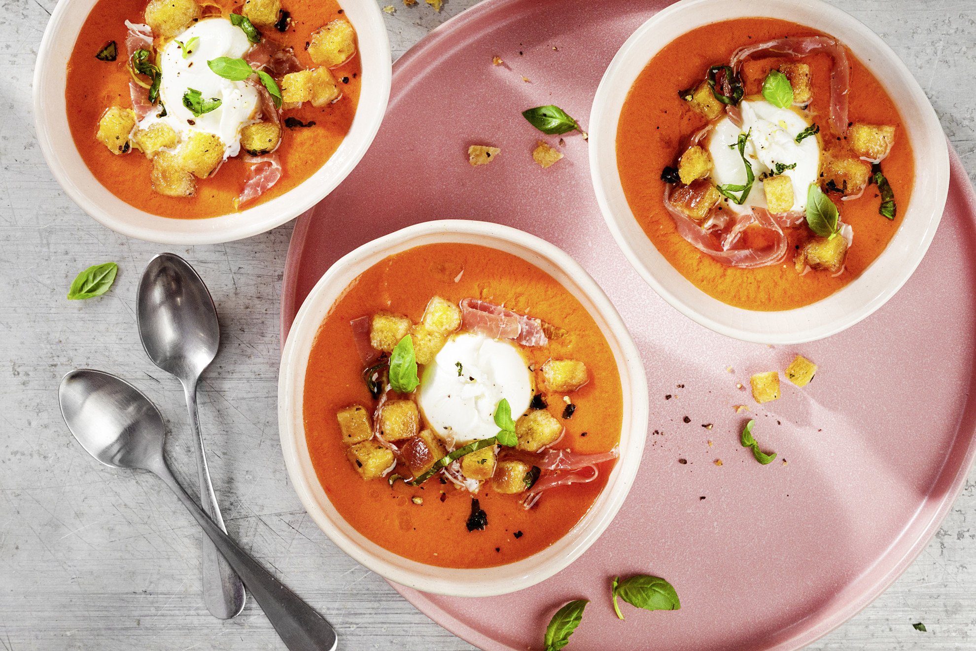 - Impiattare: impiattare il gazpacho, guarnire la burrata e il prosciutto crudo con i crostini e insaporire con l'olio al basilico restante.