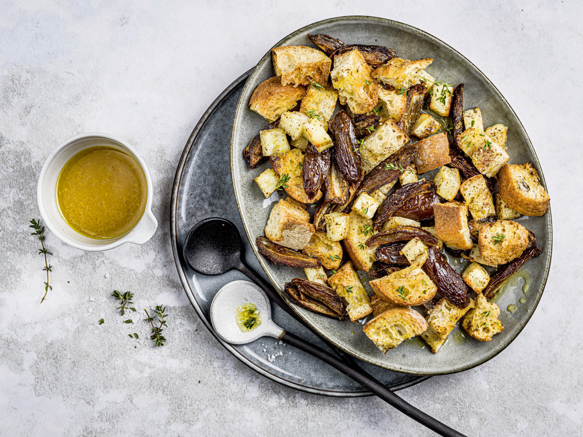 - Insalata di pane: in una ciotola mescolare l'halloumi, i datteri, il pane a cubetti e l’olio, quindi condire. Distribuire il tutto su una placca rivestita con carta da forno.