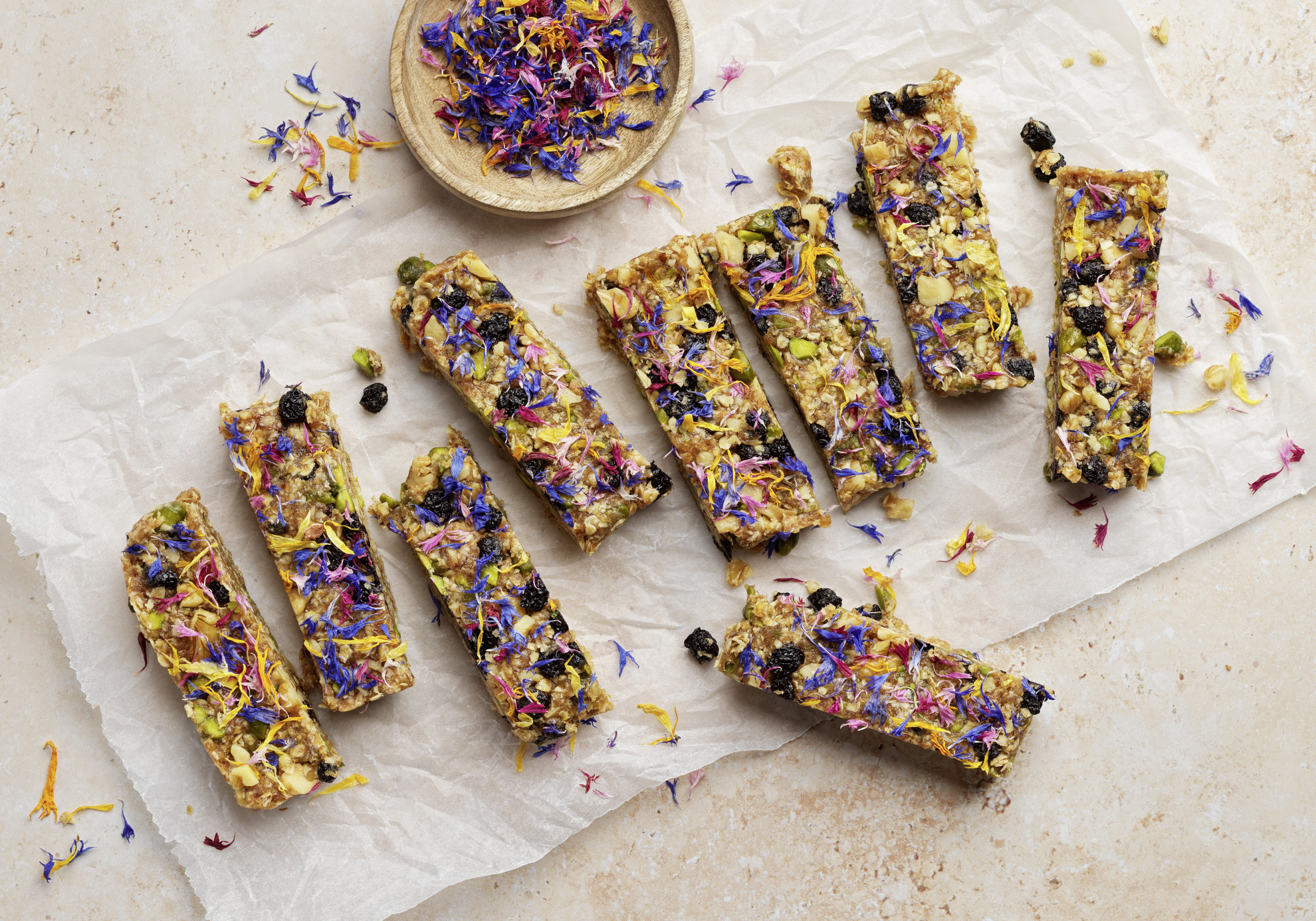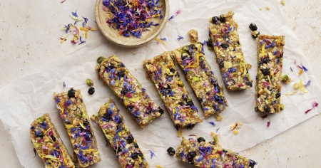 - prima di mettere in frigo, guarnire le barrette con 1 c. di fiori commestibili secchi e schiacciarli bene.