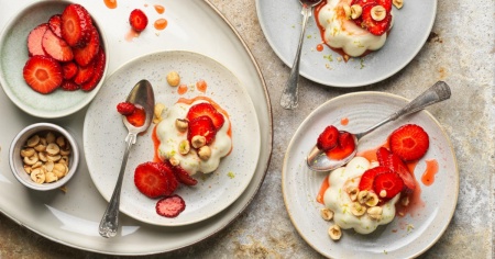 - Fragole: mettere in una ciotolina le fragole, lo sciroppo, la scorza e il succo di limetta, mescolare, quindi staccare con cura la panna cotta dal bordo degli stampini usando la punta di un coltello. Immergere brevemente gli stampini in acqua calda e capovolgere la panna cotta sui piatti. Guarnire con le fragole e le nocciole.