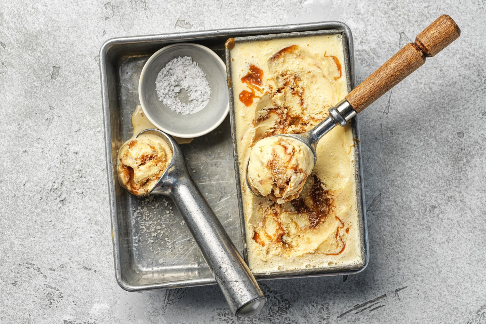 Togliere dal fuoco, unire il burro, farlo sciogliere e mescolare. Incorporare la panna e lasciar sobbollire fi no a quando il caramello si è sciolto. Far raff reddare il caramello e cospargere con il fl eur de sel. Incorporare delicatamente il caramello al gelato, quindi coprire e rimettere nel congelatore per ca. 3 ore. - Servire: formare delle palline di gelato. Cospargerle con un pizzico di fl eur de sel.