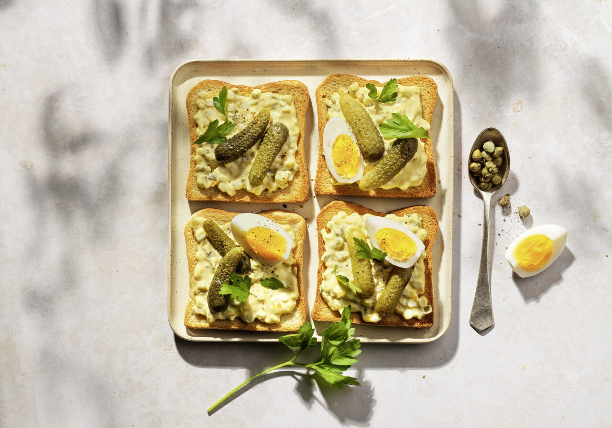 - Canapé: farcire i toast con la tartare all'uovo, i capperi e i cetriolini, quindi guarnire con l'uovo e il prezzemolo.