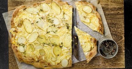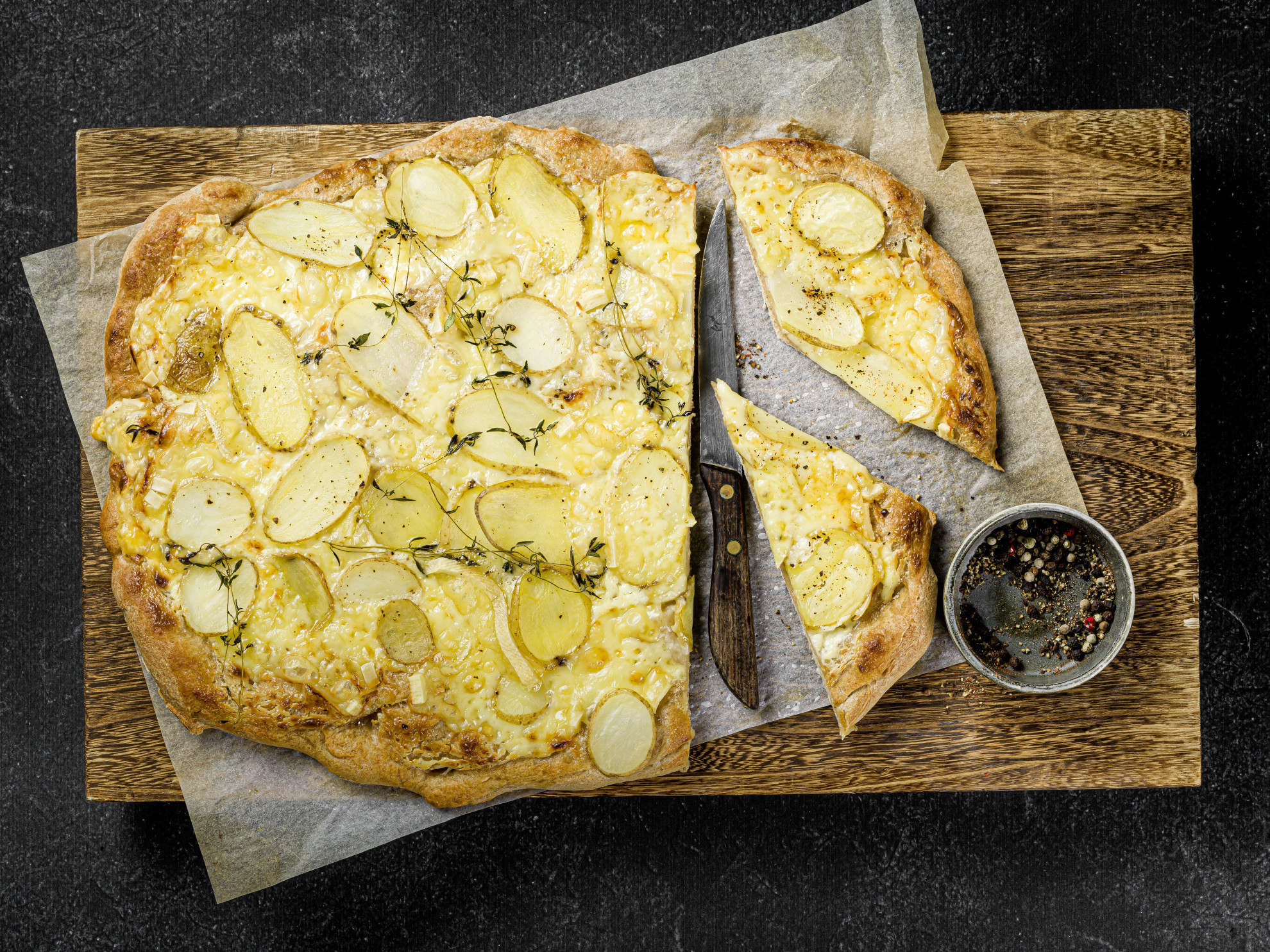 - Farcitura: mettere una placca nel forno ancora freddo e preriscaldarlo a 240 °C. Dimezzare l'impasto, formare 2 panetti, appiattirli leggermente con le mani, quindi stenderli su un po' di farina formando 2 dischi sottili e trasferire ognuno su un foglio di carta da forno. Spalmare la crème fraîche sulla pasta. Guarnire con il formaggio, le patate e il timo, quindi condire.