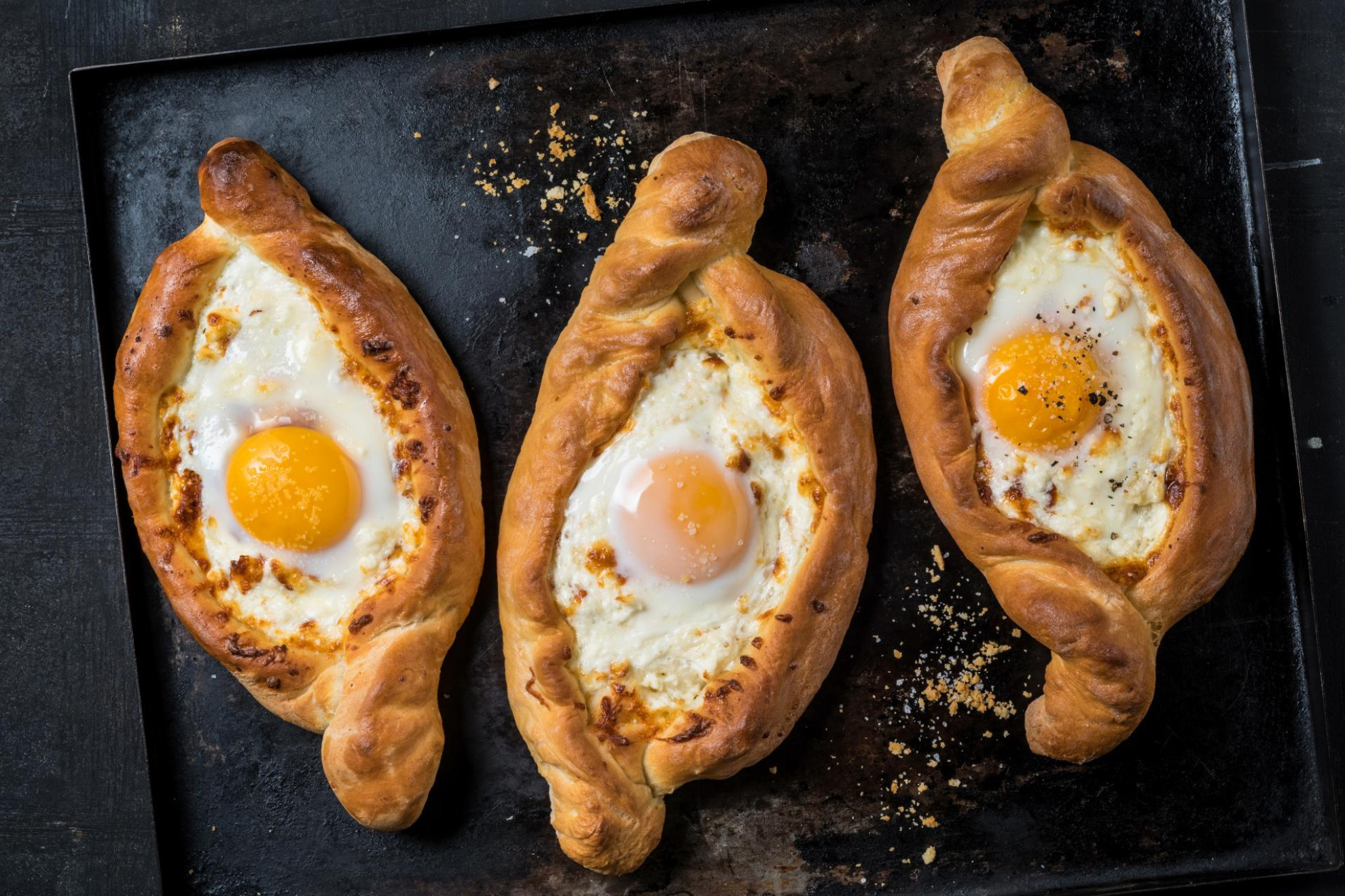 - In forno: cuocere ogni placca per ca. 17 min. nella parte inferiore del forno preriscaldato a 240°C. Sfornare, aprire un uovo alla volta e versarlo al centro di ogni Khachapuri. Incorporare l’albume al formaggio facendo attenzione a non rompere il tuorlo. Finire di cuocere i Khachapuri per ca. 3 min. nella parte superiore del forno e sfornare. Spennellare i bordi della pasta ancora caldi con il burro e servire subito. Eseguire lo stesso procedimento con l’altra placca.