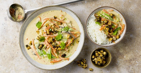 - Curry: in una pentola scaldare l'olio. Saltare le carote, il cavolo cinese e i funghi per ca. 4 min., aggiungere la pasta di arachidi e continuare la cottura per ca. 1 minuto. Unire il latte di cocco, l'acqua e le taccole, portare a ebollizione e salare. Abbassare il fuoco e lasciar sobbollire per ca. 4 minuti.