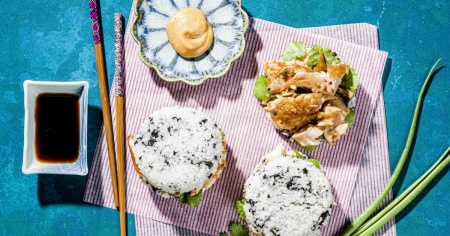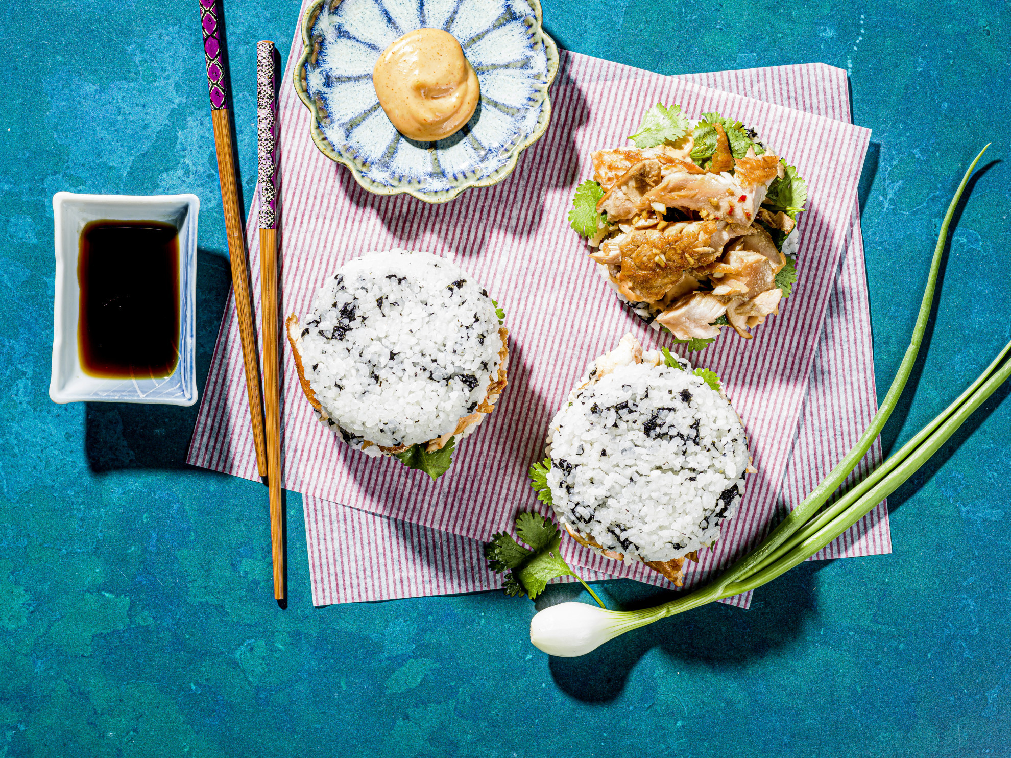 - Bap burger: mescolare la maionese e la sriracha. Spalmare la maionese su tutti i bun di riso. Guarnire la metà dei bun con il salmone e il coriandolo e coprire con i bun restanti.