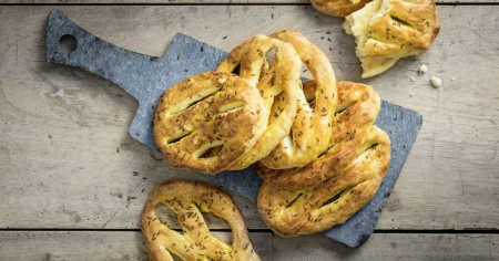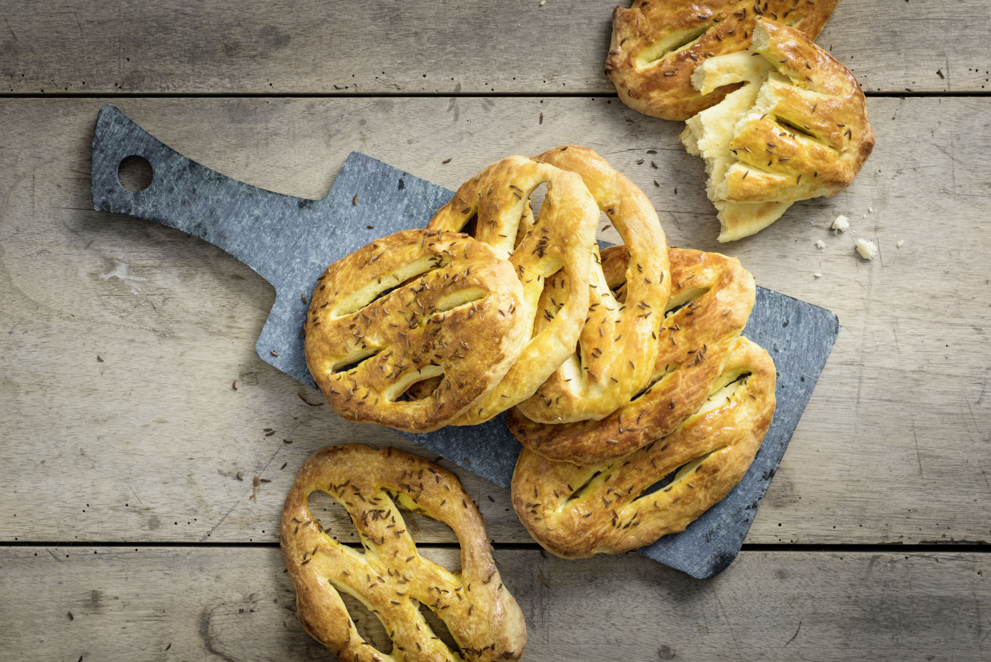 - Composizione: dividere l'impasto in 10 porzioni, spianarle in forma ovale a circa 1 cm di spessore. Praticare 4 incisioni (lunghe ca. 5 cm) nell'impasto, disporre le 10 porzioni su due carte da forno, aprire con attenzione le incisioni, così da renderle più ampie. Lasciar lievitare altri 15 minuti, spennellare con un tuorlo d'uovo, spolverare con il cumino, far scivolare la carta da forno su una placca girata.