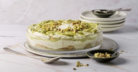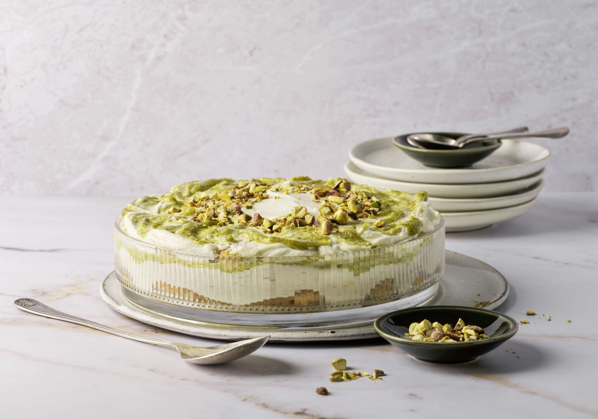 - Tiramisù: disporre nello stampo la metà dei savoiardi con la parte zuccherata rivolta verso il basso. Coprire con metà della salsa di pistacchi e distribuire sopra metà del composto di mascarpone e della crema di pistacchi. Immergere i savoiardi restanti nella salsa di pistacchi, sistemarli sopra e coprire con il composto di mascarpone e la crema di pistacchi. Cospargere di pistacchi, coprire e mettere in frigo per ca. 2 ore.