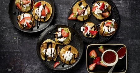 3. Presentazione: spalmare la confettura di fragole su metà dei pancake. Appoggiarvi sopra i pancake rimanenti. Guarnire con le burratine e la crema di balsamico.