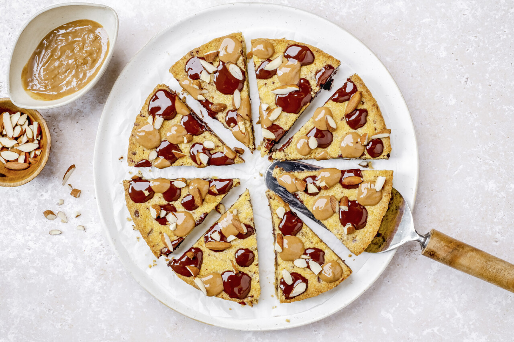 - Topping: mettere il cioccolato a bagnomaria in una ciotola dai bordi sottili evitando che questa entri a contatto con l’acqua. Sciogliere il cioccolato, mescolare per eliminare eventuali grumi e lasciarlo raffreddare. In una padella antiade- rente tostare le mandorle senza aggiunta di grassi e lasciarle raffreddare. Tagliare il cookie in 8 pezzi senza separarli. Decorare il biscotto con il cioccolato, la crema di mandorle e le mandorle.