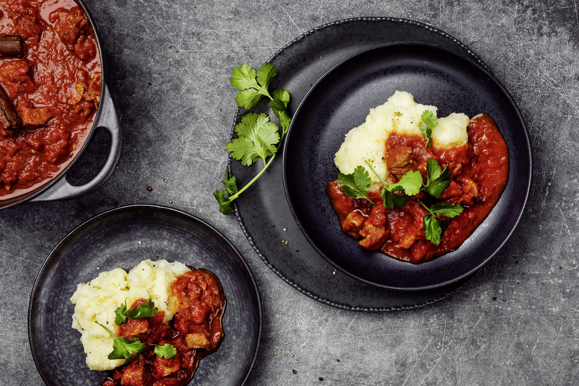 - Fufu: sciogliere l’amido di patate in 1 dl d’acqua e me tere da parte. In una pentola capiente portare a bollore l’acqua restante (5 dl). Aggiungere la semola con una frusta mescolando. Unire l’amido di patate, mescolare con un mestolo di legno per ca. 5 min. finché il composto sarà omogeneo. Impia tare il fufu con lo stufato di agnello e cospargere con il coriandolo.