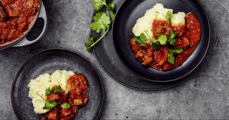- Agnello: in una coco te scaldare l’olio. Rosolare poca carne per volta per ca. 4 min., quindi toglierla e salarla. Abbassare il fuoco, so friggere per ca. 5 min. le cipolle e l’aglio. Unire la purea di pomodoro e la harissa, rosolare brevemente e quindi condire. Aggiungere i pomodori e il brodo, portare a bollore, abbassare il fuoco e aggiungere di nuovo la carne. Coprire e stufare a fuoco basso per ca. 1½ ora.