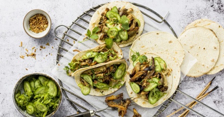 - Tacos: mescolare il sedano a coste, i cetrioli, il succo di limone e l'olio, quindi condire. Spalmare la crema di semi di girasole sulle tortilla, distribuirvi sopra i funghi e le verdure, quindi cospargere di coriandolo e cipolle arrostite.