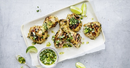 - Grigliare (grill a carbonella, a gas o elettrico): togliere il pollo dalla marinata e salarlo. Grigliare il pollo a fuoco medio o a temperatura media (ca. 200 °C) per ca. 30 min., rigirandolo di tanto in tanto e bagnandolo con il succo di limetta.