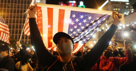 Al raduno organizzato per festeggiare la firma del presidente, molte persone hanno sventolato la bandiera americana inneggiando slogan come "Lotta per libertà, schierati con Hong Kong".