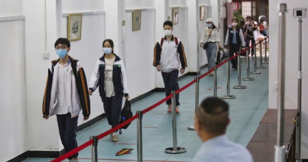 Scolari entrano nel loro istituto a Wuhan (foto d'archivio)