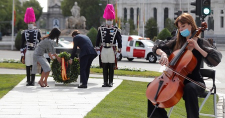 È avvenuta così l'inaugurazione del monumento alle vittime del coronavirus in Spagna. Sono stati il sindaco di Madrid, José Luis Martínez-Almeida, e la vicesindaco, Begoña Villacís, a porre la corona d'alloro sulla scultura, accompagnata da una bandiera spagnola.