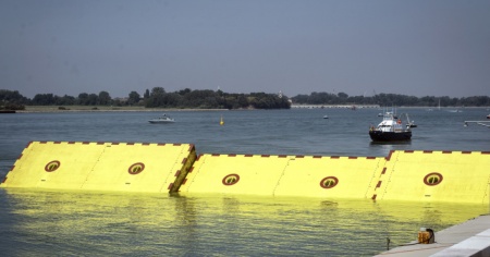 VENEZIA - Nel primo test di questo genere, alle 12.25 si è completata la chiusura di tutte le 78 paratoie mobili dei quattro varchi del Mose, il sistema di barriere che dovrebbe proteggere Venezia dalle maree eccezionali. Era la prima volta che tutti i dispositivi venivano azionati contemporaneamente. All'evento era presente anche il primo ministro italiano Giuseppe Conte.