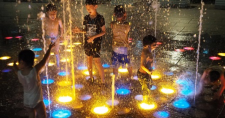 Le immagini più simboliche dell'ondata di caldo che sta avvolgendo la città sono quelle dei giovanissimi che giocano per strada, trovando un po' di refrigerio nelle fontane colorate.