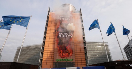 BRUXELLS - Cinque attivisti di Greenpeace hanno scalato la facciata di 14 piani della sede della Commissione Europea a Bruxelles ed esposto uno striscione di 30 metri con il messaggio "Amazon fires - Europe guilty" ("Incendi in Amazzonia, l'Europa colpevole"). Lo striscione riproduce un foro nell'edificio attraverso il quale si vede la foresta tropicale in fiamme. Alcuni attivisti a terra hanno aperto invece degli striscioni in diverse lingue. Su quello in italiano si legge "L'Europa griglia, l'Amazzonia brucia".