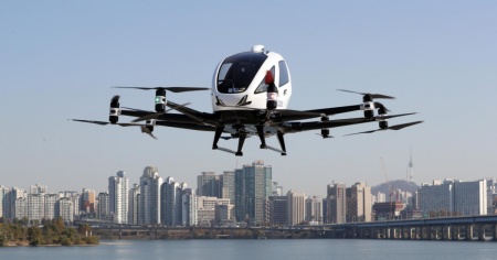 Il drone taxi EH216, provato dal governo sudcoreano, è realizzato dalla società cinese EHang. In Cina, alcuni aeromobili di questo tipo sono già utilizzati per missioni di soccorso, perlustrazione, o fotografia.