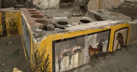 I lavori delle ultime settimane hanno fatto riemergere l'intero ambiente della taverna, con il suo bancone ad "L", raffinatamente e riccamente decorato, e i vasi con i resti dei cibi e delle pietanze cucinate che i pompeiani usavano consumare per strada.