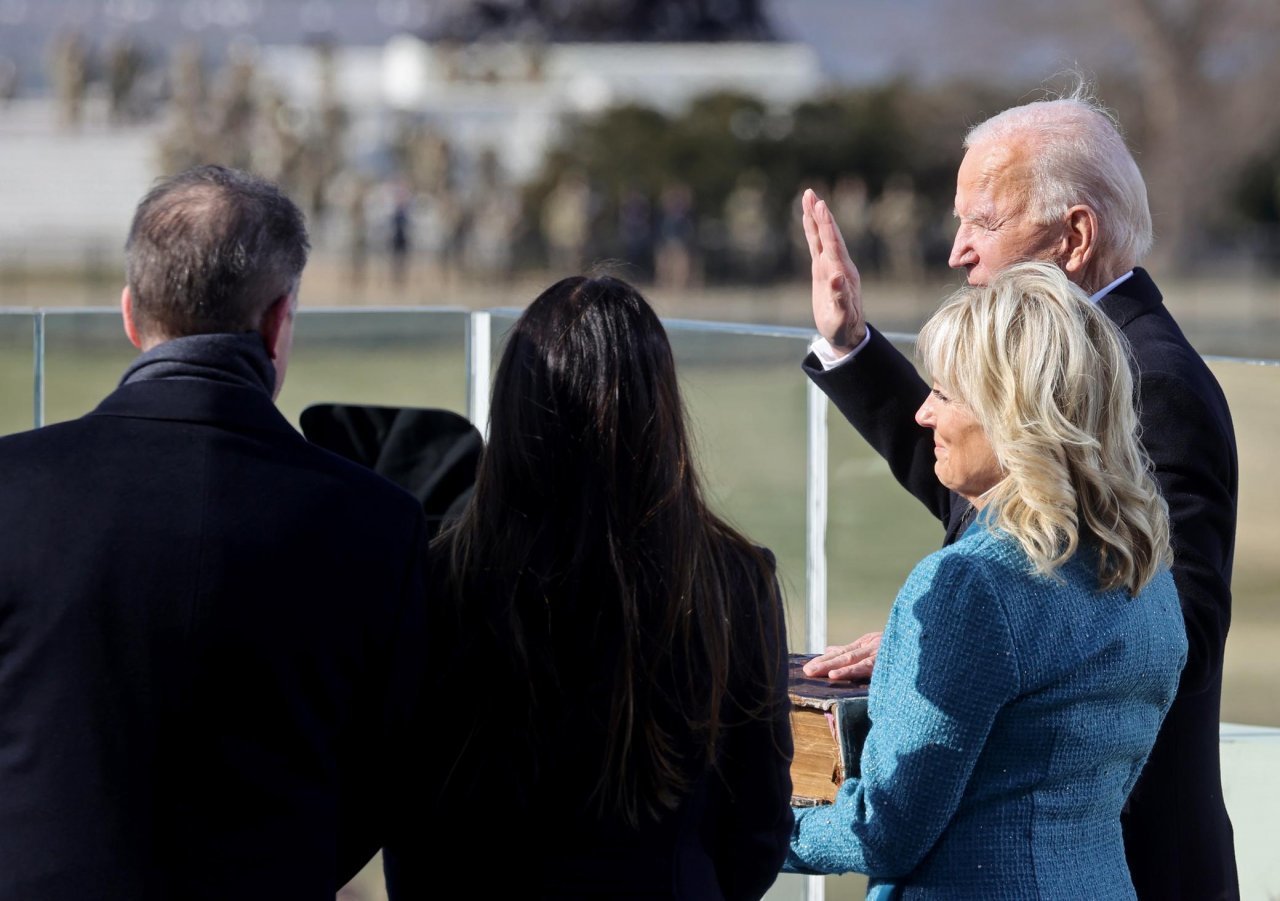 Joseph R. Biden, mentre la moglie regge la bibbia della famiglia Biden, giura come presidente degli Stati Uniti davanti al presidente della Corte Suprema, John G. Roberts. Nota di colore, la bibbia, è in possesso della famiglia del presidente dal 1893.
