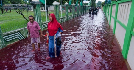 I residenti di Jenggot, vicino alla città di Pekalongan, sono stati ripresi mentre guadavano l'acqua rosso sangue e le immagini del raro fenomeno sono state poi condivise sul web.