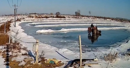 ZHAODONG - Zhaodong - Chissà cosa aveva in mente l'impavido contadino cinese, quando ha deciso di montare sul suo trattore e sfidare la sorte su una pozza ghiacciata.Il risultato non poteva che essere uno.