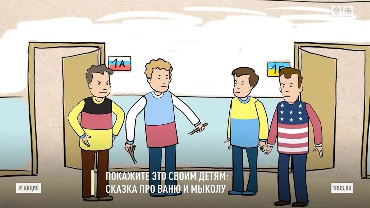 Il cartone animato di Vanja e Kolja - Perché la narrazione propagandistica di Putin sulla Russia liberatrice possa essere compresa da tutti, bambini inclusi, si è fatto ricorso anche ad un cartone animato che è stato proiettato proprio negli istituti scolastici del Paese. In esso, i rapporti tra Russia ed Ucraina, sono rappresentati da due compagni di scuola, Vanja, che indossa una t-shirt con i colori della bandiera russa, e Kolja che invece ne indossa una con i colori della bandiera ucraina. I due bambini andavano d’accordo, spiega la voce narrante, fino a che Kolja ha iniziato a frequentare “brutte compagnie”, ossia un ragazzo con la maglietta a stelle e strisce ed uno con i colori della bandiera tedesca. Questi ragazzacci insegnano a Kolja a picchiare gli altri bambini, che simboleggiano le repubbliche indipendentiste di Lugansk e Donetsk, fino a che non interviene Vanja il buono che disarma l’ex amico Kolja. Alla fine del cartone animato, viene spiegato ai bambini che non si tratta di una vera e propria guerra ma del tentativo, da parte della Russia, di disarmare l’Ucraina per riportare la pace nel mondo.