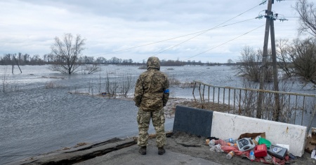 L'allagamento è avvenuto due giorni dopo l'invasione russa. Più tardi, i bombardamenti russi hanno danneggiato la diga, complicando gli sforzi per drenare l'area, e infatti ora, due mesi dopo, si vedono ancora gli abitanti passare per le strade su un gommone.