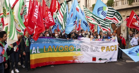 In testa al corteo, i sindacati Cigl, Cisl e Uil uniti dallo striscione 'al lavoro per la pace' e accompagnati dalle note di 'Bella Ciao' e dalle canzoni di Calcutta e dei Negrita.